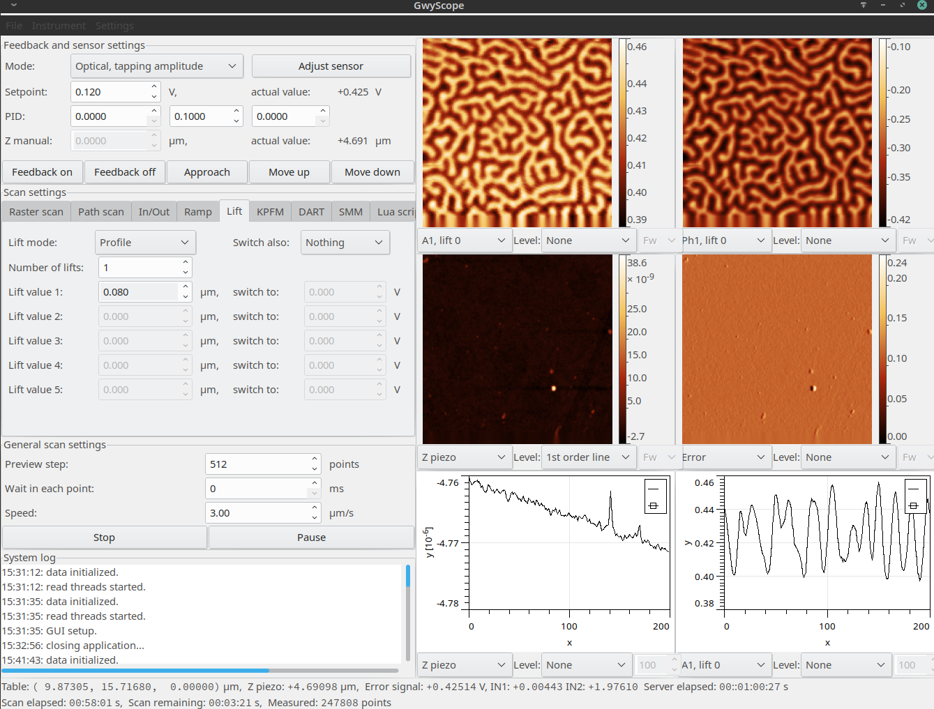 MFM measurements are performed in tapping mode, so to perform MFM with Gwyscope, first set up the tapping mode. When done, set the dual path measurement and let the microscope collect amplitude and phase in some distance above surface, typically in tens of nanometers. When number of lifts is non-zero, additional channels can be selected for the previews (both for image and graph) and the data measured in lift can be visualized.