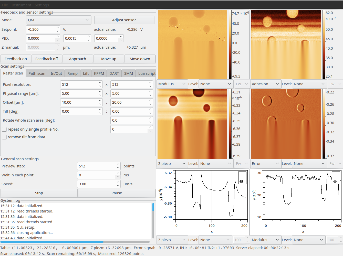 If all of this seems to work and curves are repeatable, include both the part in the contact and out of the contact, you can close the dialogue and start scanning. If the QM mode is selected, your scan list will automatically include the mechanical response signals, like Modulus, Adhesion, etc. as shown here: