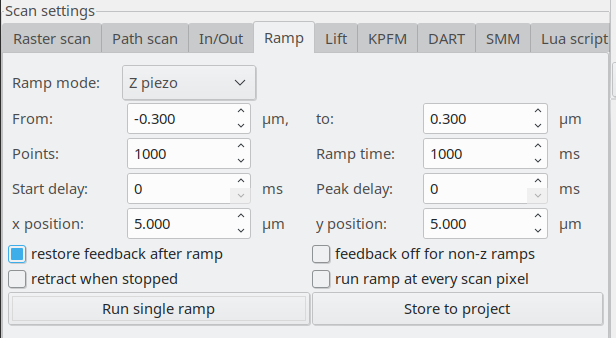 The “Ramp” tab in “Scan settings” area allows to perform ramps - to measure dependence of some quantity on some other quantity, e.g. a force-distance curve or I/V spectrum.