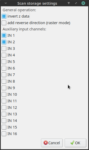 Numbers of channels here are related to 16 inputs of the Gwyscope electronics. Some other channels are added to this set automatically, either always (e.g. Error signal, X, Y and Z piezo) or based on the measurement regime (e.g. KPFM, Frequency shift). This is also place to enable reverse scan data storage (which makes sense only for raster scans).