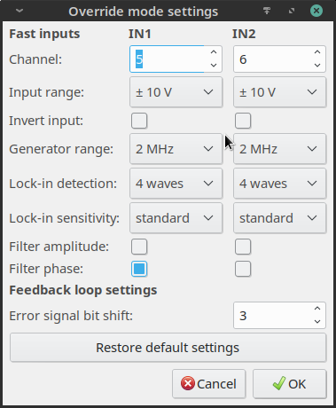 The measurement mode settings which are loaded from hwserver.ini file can be overriden using the “Override mode settings” dialogue, as shown here: