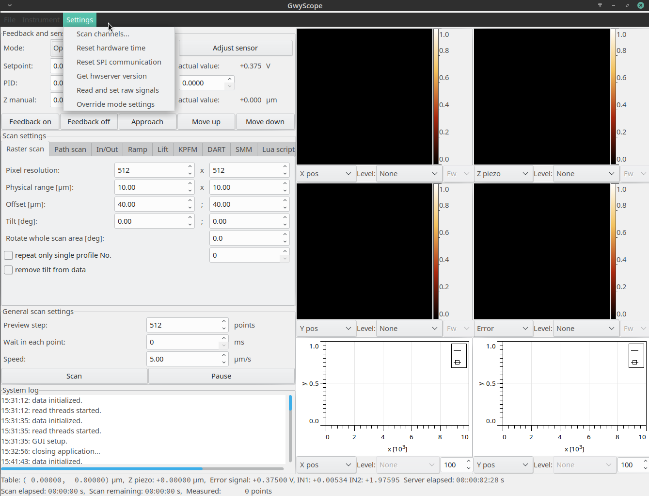 Scanning regimes that can be operated from Gwyscope GUI mirror the scanning regimes on the hwserver. Different modes of operation can be seen in the main window, together with controls for the feedback loop:
